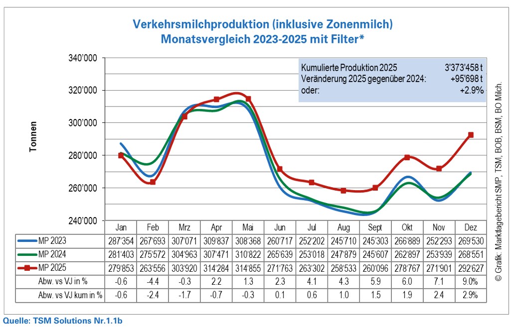 Anpassung des A-Preises: In einer ausserordentlichen Sitzung Mitte Dezember 2025 senkte der Vorstand der BO Milch den A-Richtpreis per 1. Februar um 4 Rappen bis Ende 2026, um die Preisdifferenz zur Europäischen Union zu verringern und damit die Marktanteile der Schweizer Milchprodukte zu sichern. Sollten diese Marktanteile aufgrund einer Überproduktion verloren gehen, würde sich das Problem weiter verschärfen.