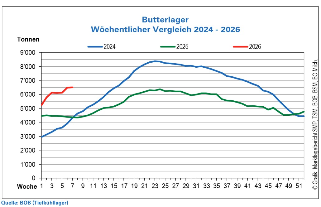 Die Industriemilch durchläuft seit Ende Sommer 2025 eine schwierige Phase. Der Preisdruck im Grosshandel hat sich verstärkt, und die sinkenden Preise auf den ausländischen Märkten sowie die Lagerbestände belasten die Bewertungen. Der Rückgang des A-Milchpreises um 4 Rappen im vergangenen Februar ist eine direkte Folge davon. Derzeit befinden sich die Preise im Industriemilchsektor auf einem Tiefstand. Der Anstieg der Preise auf den internationalen Märkten ist das erste Anzeichen für eine strukturelle Verbesserung, die sich jedoch noch in weiter Ferne abzeichnet.