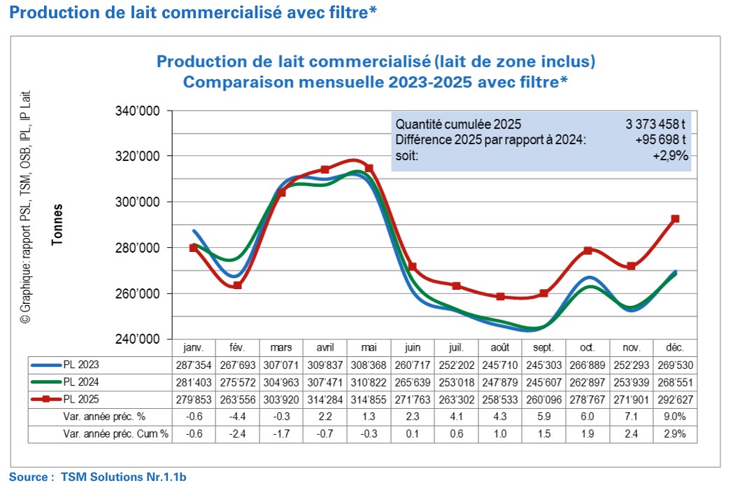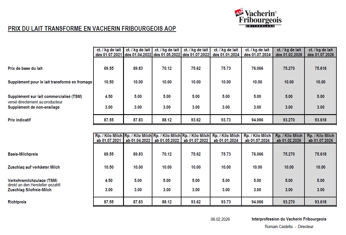 Adaptation du prix A : Dans une séance extraordinaire à la mi-décembre 2025, le comité de l’IP-lait a baissé le prix cible A de 4 centimes au 1er février et ceci jusqu’à la fin de l’année 2026 dans l’idée de diminuer la différence de prix avec l’Union européenne et d’assurer ainsi les parts de marché des produits laitiers suisses. Si ces parts de marché venaient à être perdues en situation de surproduction, le problème s’accentuerait davantage.