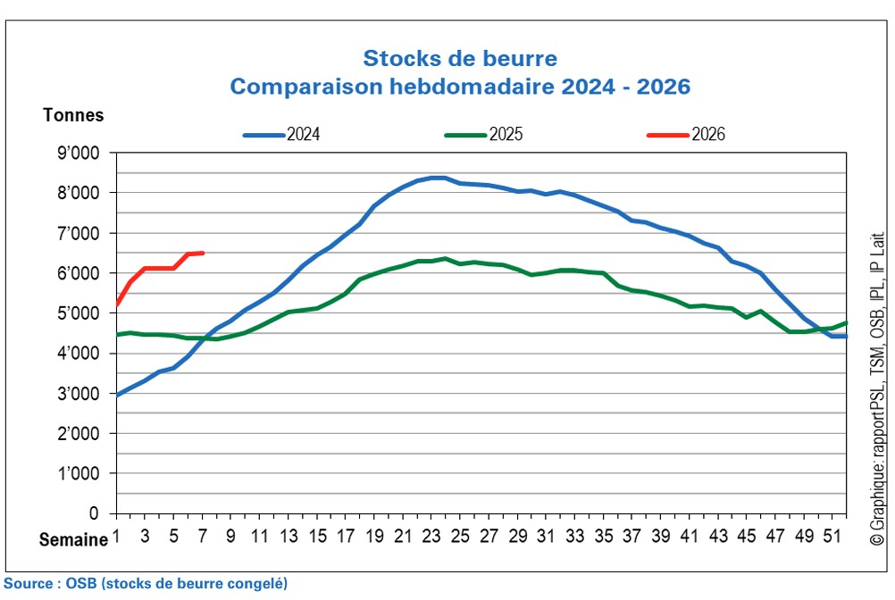 Les stocks de beurre ont atteint un niveau très élevé particulièrement inquiétant. Pour commencer l’année sereinement, le stock idéal se situe entre 1’000 et 1’500 tonnes. Cet objectif est dépassé actuellement a été dépassé de 4’000 tonnes, ceci alors le pic des livraisons printanières n’est pas encore arrivé.